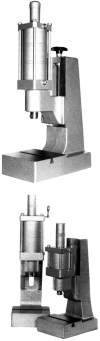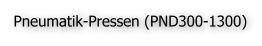 Die Pressen können zusätzlich in pneumatischer Ausführung geliefert werden. Dabei übernimmt ein Pneumatikzylinder die Hubbewegung und überwindet die Federspannung bis zur Schlagauslösung. Der Handhebel wird dann nur zum Einrichten der Maschine montiert. Pressen der Serie PND arbeiten mit doppelt wirkenden Zylindern. Es stehen Druckleistungen von 300-1300 kp zur Verfügung. Die Spindeln sind gehärtet und geschliffen. Der Pressentisch ist mit einer T- Nute nach DIN 650 versehen. Alle Typen haben eine Arbeitshöhenverstellung mit Gewindespindel. Die Arbeitshöhe kann über die Spindel schnell voreingestellt werden. Zusätzlich hat die Kolbenstange einen klemmbaren Einstellring. Damit kann der Hub begrenzt und eine Feineinstellung vorgenommen werden. Die Kolbenstange des Zylinders ist verdrehgesichert.